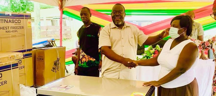 Beneficiaries received a wide range of working tools and trading items, including deep freezers, sewing machines, welding and cocoa spraying machines, bales of used clothing, disposable takeaway packs, agrochemicals, and assorted foodstuffs such as maize, millet, rice, cooking oil, and smoked fish for resale.