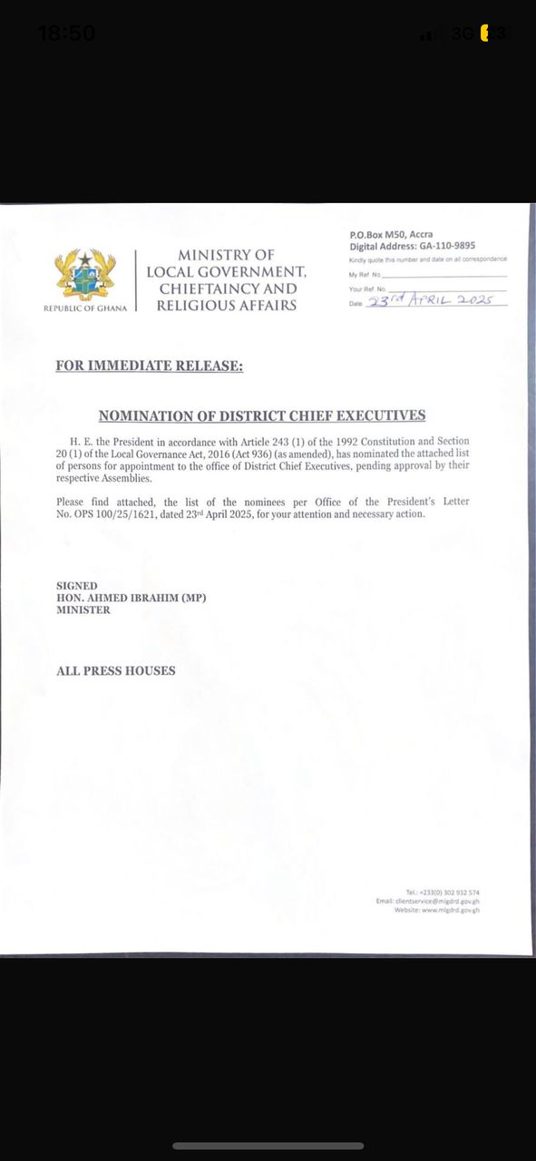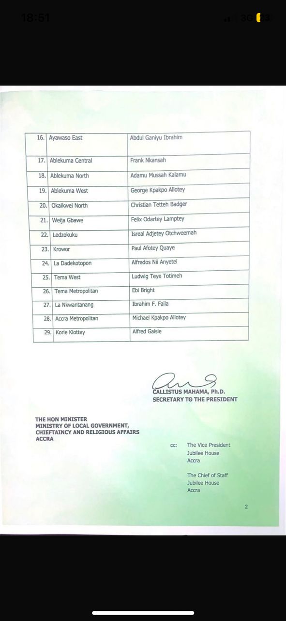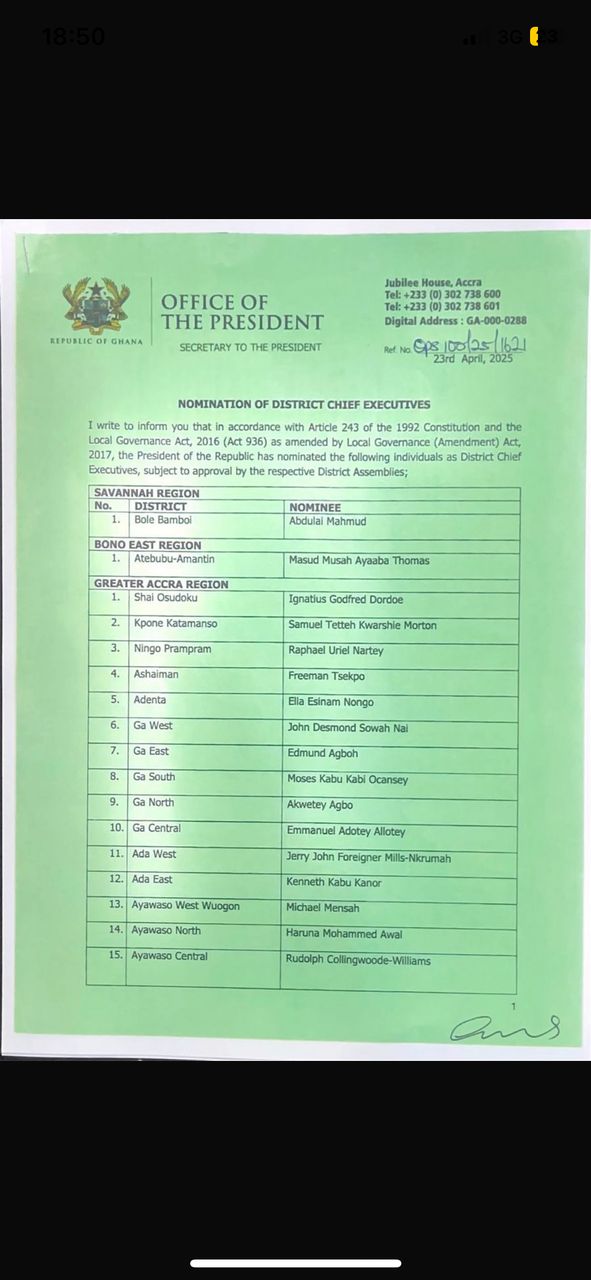 President John Dramani Mahama in accordance with Article 243 (1) of the 1992 constitution and 20 (1) of the Local Government Act, 2016 (Act 936) has nominated the Second and Third batches of persons to serve in various capacities as Metropolitan Municipal and District Chief Executives.